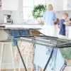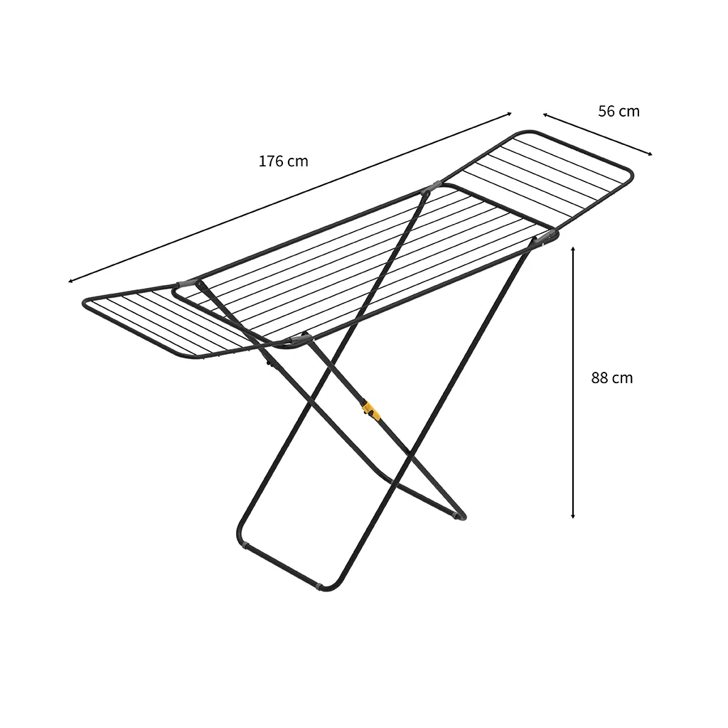 Stabiler Wäscheständer mit allem Extras. Robuste Trockenleinen, die die Trocknungszeit reduzieren. Patentierte Konstruktion, die die Flügel für eine einfache Handhabung und Aufbewahrung verriegelt, sowie ein Verriegelungsmechanismus, der die Beine in ausgeklappter Position für zusätzliche Sicherheit fixiert.
